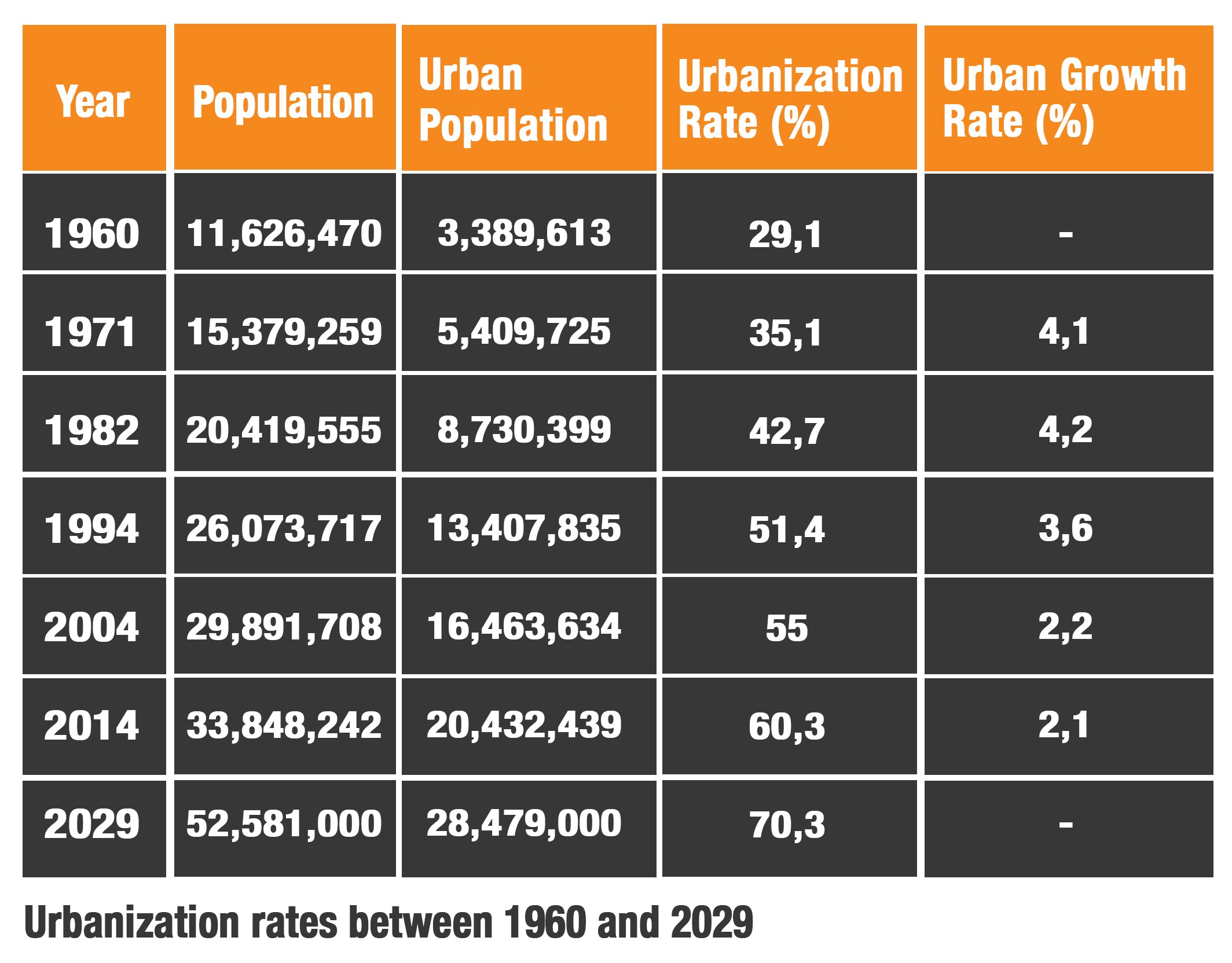 In the early twentieth century, and before the colonial administration imposed its rule over the country (1912-1956), urbanization rates in Morocco were small – 8 percent. In a period of fifty years (1960-2014), urbanization leaped from 29 to more than 60 percent – and, according to official projections by the Office of the High Commissioner for Planning, could reach more than 70 percent in 2030. The inhabitants of the biggest seven cities make up more than 41 percent of the total urban population – 25 percent of the population (1) in 2014.