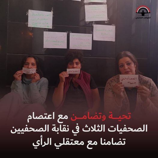 - من يومين أعلنت ٣ صحفيات مصريات، هما رشا عزب وإيمان عوف ومنى سليم، الاعتصام في نقابة الصحفيين والإضراب عن الطعام تضامنا مع الناشط المعتقل علاء عبد الفتاح اللي أضرب كليا عن الطعام والشراب، ومعتقلي الرأي في مصر وعلى رأسهم الصحفيين المعتقلين على خلفية عملهم الصحفي.