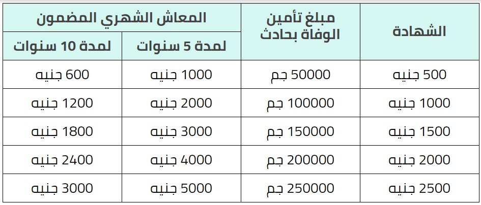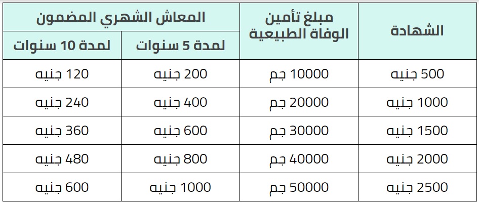 ويحصّل ورثة المُؤمّن عليه المبلغ إما دفعة واحدة، أو كمعاش يتمّ صرفه على النحو المبين في هذين الجدولين، واللذين حصل «مدى مصر» عليهما من أحد فروع بنك مصر.