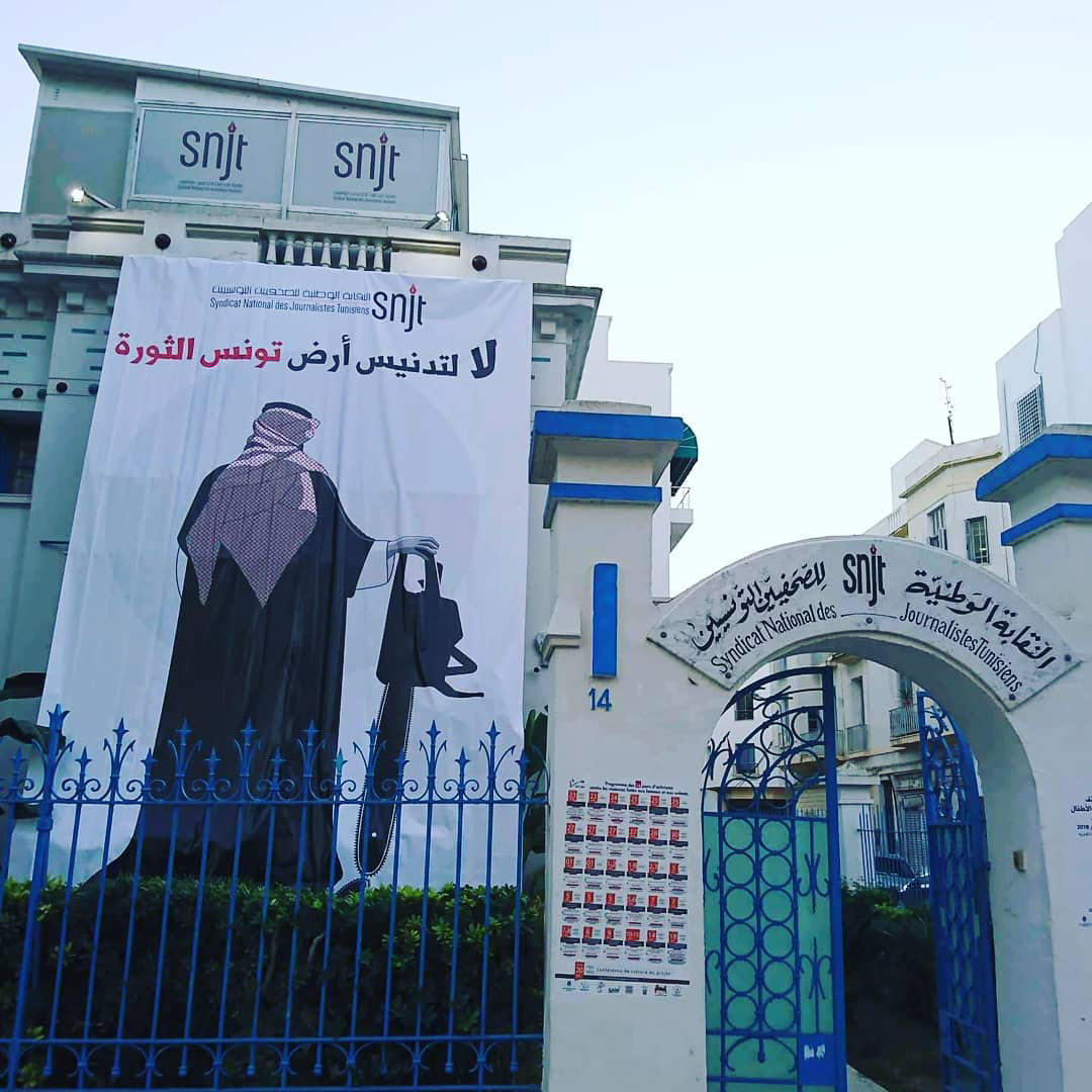 • معلقة جدارية فوق مبنى نقابة الصحافيين التونسيين وأخرى فوق مبنى جمعية النساء الديمقراطيات، رفضاً لقدوم محمد بن سلمان الذي ظهر في ملصقات التظاهرات العديدة حاملاً منشاراً كهربائياً في إشارة إلى اغتيال جمال خاشقجي. وقد وجهت نقابة الصحافيين رسالة علنية إلى رئيس الجمهورية استنكاراً لهذه الزيارة، كما قدمت شكوى ضد بن سلمان في المحاكم التونسية بتهمة ارتكاب جرائم حرب ضد اليمنيين. الحرب على اليمن، والتطبيع مع الكيان الصهيوني والدور السعودي في "صفقة القرن"، بالإضافة إلى ايواء الرئيس التونسي المخلوع، كلها أسباب تبرر الغضب من قدوم بن سلمان. وقد كان لهذه التحركات اثرها إذ استقبل بن سلمان في قصر الرئاسة من قبل قايد السبسي بشكل خافت وجرى الغاء المؤتمر الصحافي واكتُفي ببيان من الرئاسة.