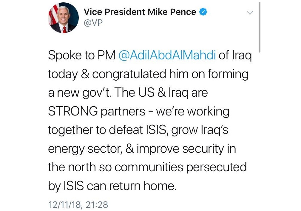 وتنشر "العالم الجديد" تغريدة نائب الرئيس الأميركي على حسابه في تويتر، التي يوضح من خلالها سبب الاتصال بعبدالمهدي، والذي لخصه بالقول "تحدثت اليوم (أمس) الى رئيس الوزراء عادل عبد المهدي حول أمن الأقليات العراقية والتنوع. نتمنى من العراق والولايات المتحدة واوروبا وجميع الدول الصديقة أن تخرج الأقليات من الكارثة التي يعيشون فيها من أربعة سنوات".