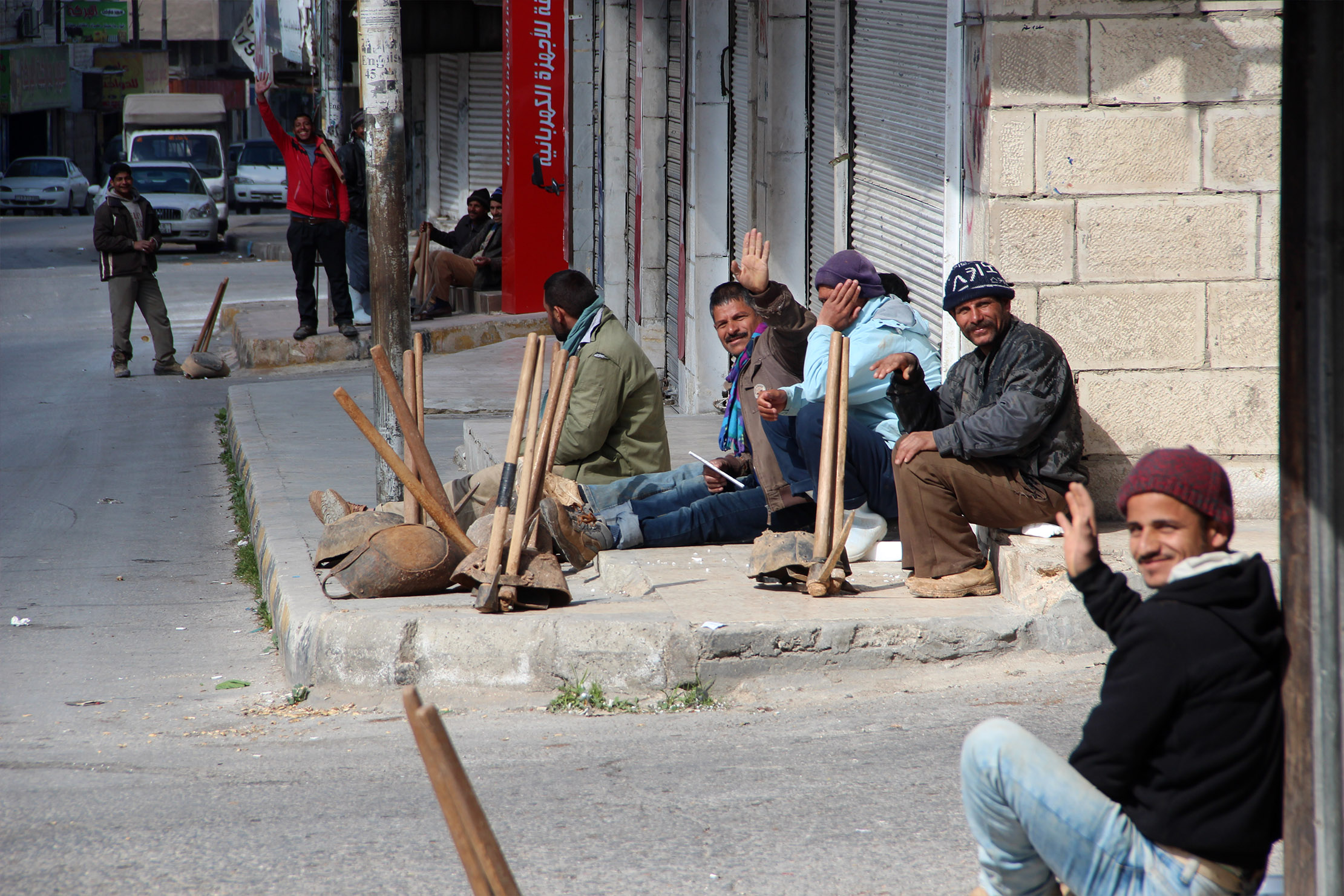 كانت المجموعة الأولى قد ابتعدت نحو كيلو مترٍ عن مكان التجمع الرئيسيّ أمام البلدية، وجلست قرب متجر مغلقٍ، ومعها عدّة (أدوات) العمل التي تتكوّن من فأس، ومجرفة، وقفّة، وجزمات (أحذية) بلاستيكيّة طويلة. «إحنا هِنا في عمّال وفي معلّمين؛ المعلّم مهنته وحدة، أمّا إحنا بنشتغل كل حاجة» (نحن هنا ننقسم إلى عمّال عاديّين وحرفيّين، العامل يشتغل في كلّ المجالات، أمّا الحرفيّ فيتخصّص في عمل واحد ويكون رئيس عمّال)، يقول رجب دسوقي، الذي أمضى 12 سنة في الأردنّ، ومثله رفيقه محمّد مختار عبد الباسط سيّد، الذي أتى الأردن كمشغّل وِنش (رافعة مواد البناء للأدوار العلويّة، ويُسمى شعبيًا صرصور)، وكلاهما من الصعيد. «بنشتغل كلَّ حاجة إلّا القصارة والبلاط، اللي بيجي عامل يبقى عامل، واللي بيجي معلّم بيبقى معلّم على طول» (نعمل في كلّ المجالات إلاّ وضع طبقات الوقاية للجدران وتزيين الأرضيات بالخزف، من يأتي هنا عاملا عاديا يبقى مجرّد عامل، ومن يأتي منذ البداية حرفيّا يبقى دائما حرفيّا)، يقول محمد.