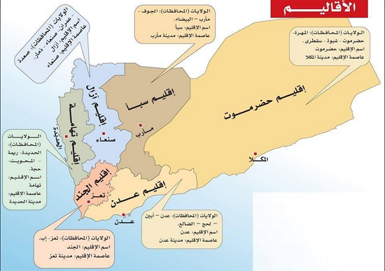 بعد جدل واسع حول عدد الأقاليم التي يجب أن تتكون منها الدولة الاتحادية الجديدة، أصدر الرئيس هادي قرارا بتشكيل لجنة تحديد الأقاليم من 21 عضوا برئاسته. وقد أعلنت هذه اللجنة قرارها الذي لا يقبل النقض (ما يخالف المبادرة الخليجية ومخرجات الحوار الوطني التي تنص على خضوع قرارات كهذه للاستفتاء قبل إقرارها)، بتقسيم اليمن إلى ستة أقاليم، اثنان منهما في الجنوب وأربعة في الشمال. لم يستغرق الانتهاء الى هذا القرار أكثر من أسبوع من العمل، بينما هو يرسم مصير اليمن و25 مليون إنسان. فهل راعى القرار العوامل الجغرافية والاقتصادية والثقافية والسكانية والتاريخية؟ هذا التقسيم كان سياسيا بامتياز. وهذه الإقاليم هي حضرموت وعدن في الجنوب والجند وسبأ وتهامة وآزال في الشمال. وتنشر «السفير العربي» تباعا ملامح كل واحد من تلك الأقاليم.