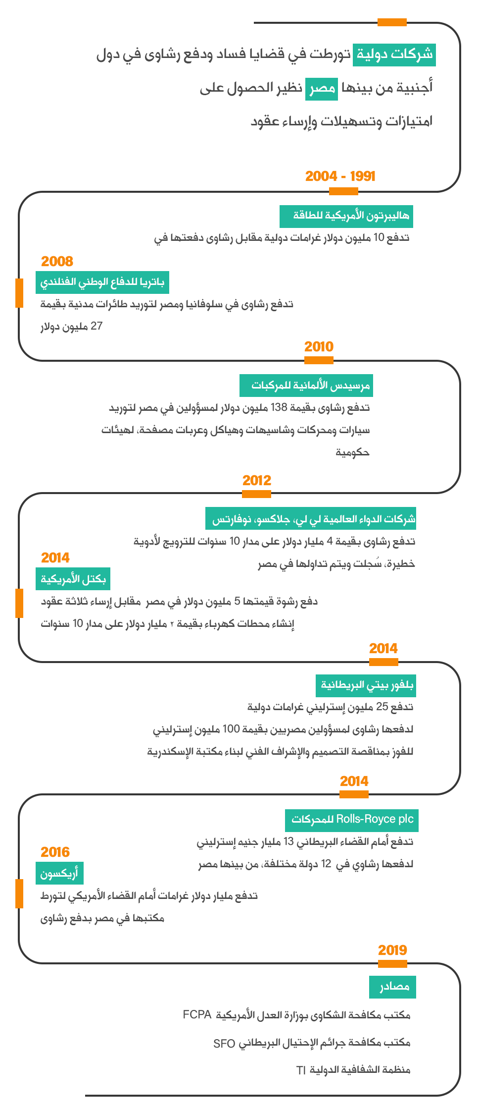 هناك 3 شركات متعددة الجنسيات تعمل في مصر، وهي الأعلى حضوراً تحت مظلة "زيادة الاستثمار الأجنبي"، بينما هي ضمن قائمة تضم 10 شركات أخرى على الأقل كشفت جهات تحقيق دولية على مدار 20 عاماً عن تورطها في دفع رشاً لمسؤولين مصريين وعرب.