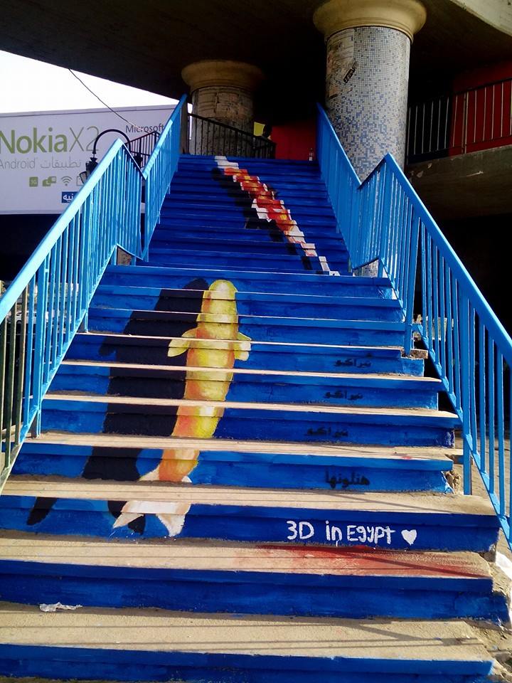 انتشرت بين مستخدمي شبكات التواصل الاجتماعي منذ حوالي الشهرين صور لسلالم ملونة في القاهرة، وتحديدا في منطقة ماسبيرو، الصور لسلم كوبري السادس من أكتوبر، درجات السلم ملونة بألوان مختلفة، وعليها أسماك ثلاثية الأبعاد. كانت تلك الصور وفق تعليقات المتابعين تمثل مصدرا من مصادر قليلة للبهجة في وضع سياسي واجتماعي سيئ تمر به البلاد.