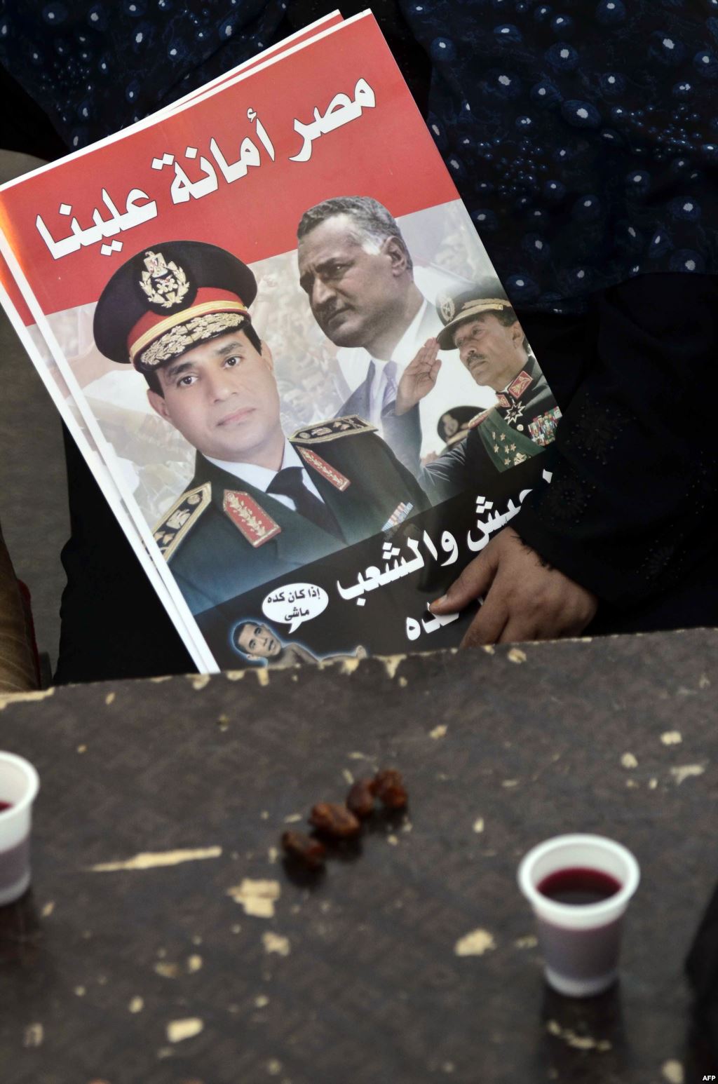 يحاول المشير السيسي استعادة زيّ عبدالناصر العسكري الذي يؤكد على قيمة وأهمية المؤسسة العسكرية وعلى رفضه التام لعودة الإخوان المسلمين للحياة السياسية. وهو هنا يقف على خط التماس مع ما فعله عبد الناصر ضد الإخوان، وأنهما معاً يشكلان أكبر أعداء مشروع الإخوان السياسي في تاريخ مصر الحديث. وكذلك يستغل السيسي حب المصريين واحترامهم للمؤسسة العسكرية من أجل الحصول على شعبية أكبر، ولعل اختيار المشير بأن يعلن ترشحه للرئاسة بزيّه العسكري الرسمي تجسيد لذلك. ويؤكد الرجل على رفضه التام لكلمة "العسكر" (التي تمتلك حمولة سلبية وتبرز الجانب القمعي أو التسلطي)، والتي كان يستخدمها البعض من أجل الهجوم على المجلس العسكري الذي حكم مصر بعد "ثورة يناير 2011"، حتى أنه تخلّى عن هدوئه المعتاد ورفض تلفظ المذيع بتلك الكلمة حين سأله عنها في لقاء تلفزيوني وقال له نصا: "مش هسمحلك تقول كلمة العسكر مرة تانية".