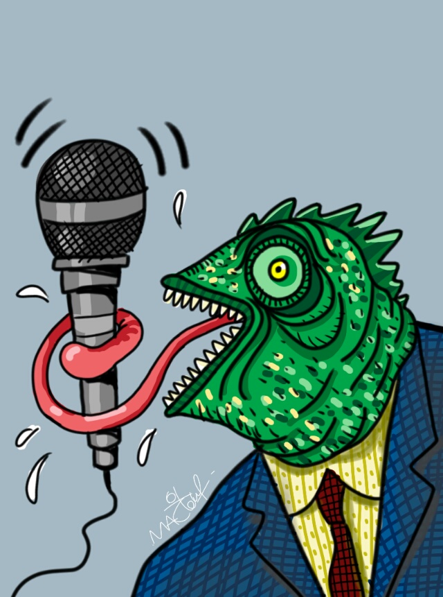 سعت السحلية الشابة جاهدة للوصول للسلطة، ونجحت بشكل كبير، ولم يتوقف حجمها عن التضخم، تحولت إلى ديناصور كبير، ثم ديناصور ضخم، وعلى قدر ما يتضخم حجم الديناصور كانت مناصبه تزداد. نحن الآن نراه وهو رئيس الديناصورات. تجلس الديناصورات الصغيرة حوله ولا يتوقف عن الكلام، ساعة ساعتين ثلاثاً، لا شيء يريده الديناصور من الدنيا سوى أن يتكلم ويحقق حلمه القديم. ولا أحد يقاطعه أخيراً.