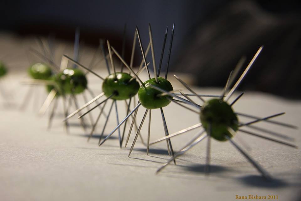 الآن، في هذا الموسم، وعلى عادتهم في كلّ عام، قطع المستوطنون الصهاينة بمؤازرة قوات الاحتلال، مئات أشجار الزيتون في جميع أنحاء الضفة الغربية. ذلك أن الشجرة «المقدسة» باتت رمزا للقضية الفلسطينية، هذا عدا الرغبة بتمويت الأرض والناس. حبّة الزيتون المعذبة، كما تشير الدبابيس المغروسة فيها تشير رغم ذلك إلى الأمل والفرحة.