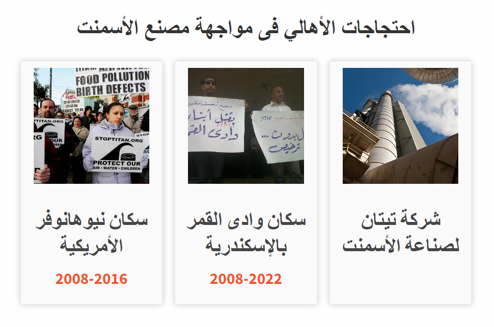 ثلاثة مشاهد لخّصت الفرق بين المعركتين ضد مصنع أسمنت "تيتان"، والتي خاضها كلٌ من سكان "وادي القمر" بمحافظة الإسكندرية، وسكان مقاطعة "نيوهانوفر" الأمريكية - التابعة لولاية جنوب كارولينا - في الجانب الآخر من المحيط الأطلسي.