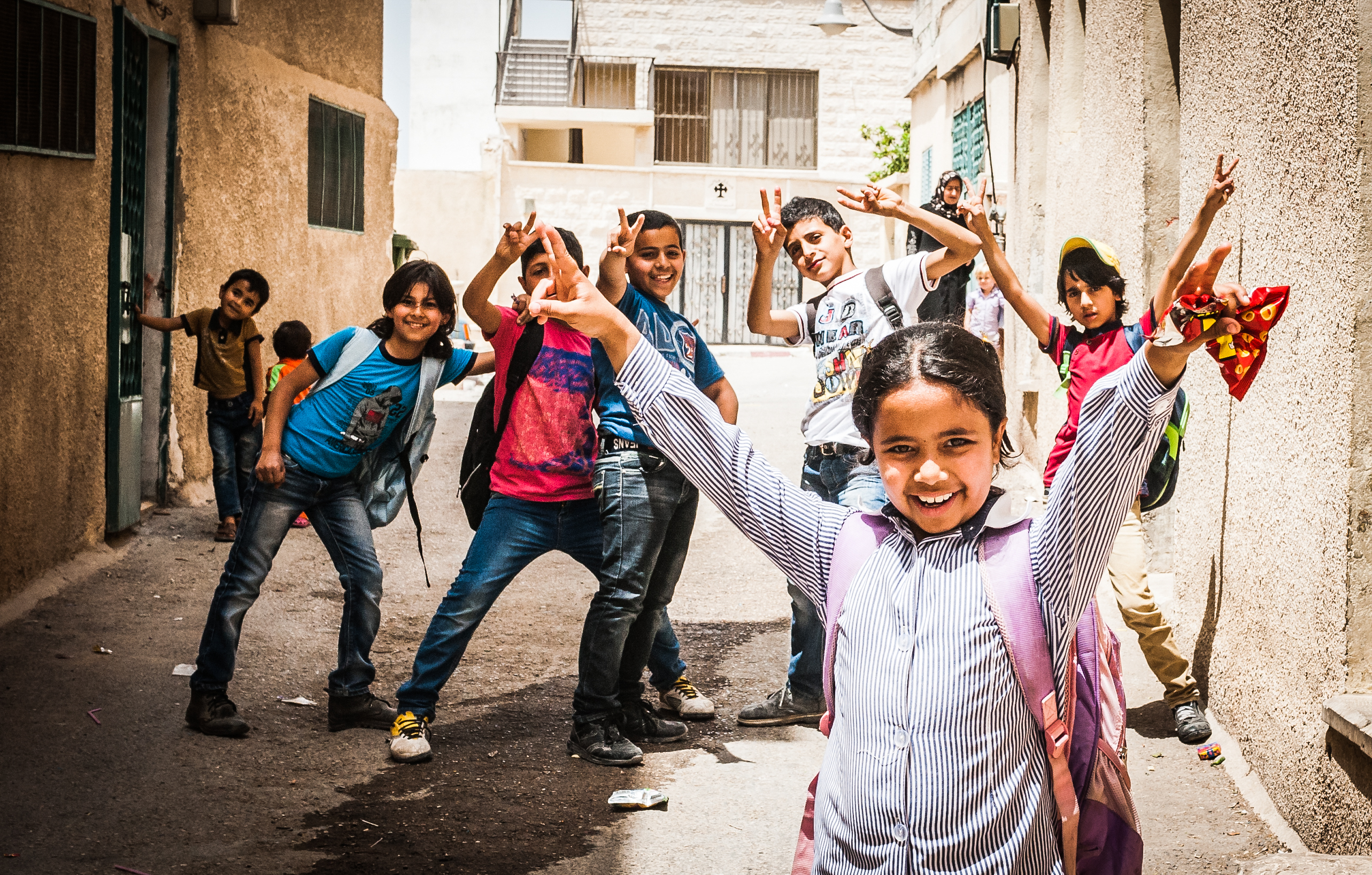 لماذا هذه الصّور؟ أحياناً أشكّ في كون شارة النّصر قد أصبحت "كليشيه" فأحاول الابتعاد عنها، لكن عندما يرى المرء الأطفال وهم يقفزون أمامه في الشارع رافعين أصابعهم يعرف أنّ هناك أشياء تولد بالفطرة ولا تحتاج إلى تعليم...هذه أصابع غير متصنعة وثابتة مثل الطفولة. (تصوير: محمد بدارنة - فلسطين)