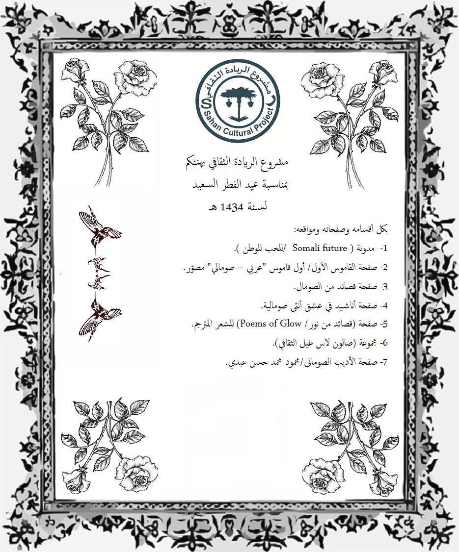 مشروع "الريادة / SAHAN" الثقافي (للترجمة وللنشر وللتعارف الإبداعي..) مسعى مستمر منذ ثمانية أعوام لخدمة الثقافة العربية في الصومال، تجاوباً مع حقيقة أن اللغة العربية وثقافتها تحولتا إلى حاجة يومية لفئة كبيرة من الصوماليين، كونها أداة يومية في تعاملاتهم، ومصدرا أساسياً لقيمهم ونظرتهم الكلية للكون والحياة. وهو بُعدٌ جديد أخذته الثقافة العربية وأدوارها في المجتمع الصومالي، بما يتجاوز القيمة الدينية التقليدية للغة في هذا المجتمع المسلم.