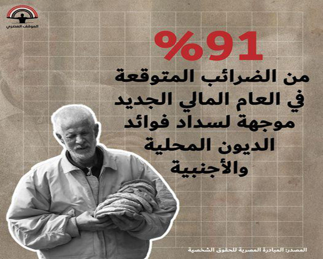 - كل جنيه بيدفعوا المصريين من ضرائبهم بيروح منه 91 قرش لسداد فوائد سنوات الاقتراض الماضية، وتضخم الدين الحكومي بفعل الإنفاق على "المشروعات القومية"، وسنوات من السياسات الاقتصادية اللي بتستسهل تخفيض سعر الصرف كحل للأزمة الاقتصادية.