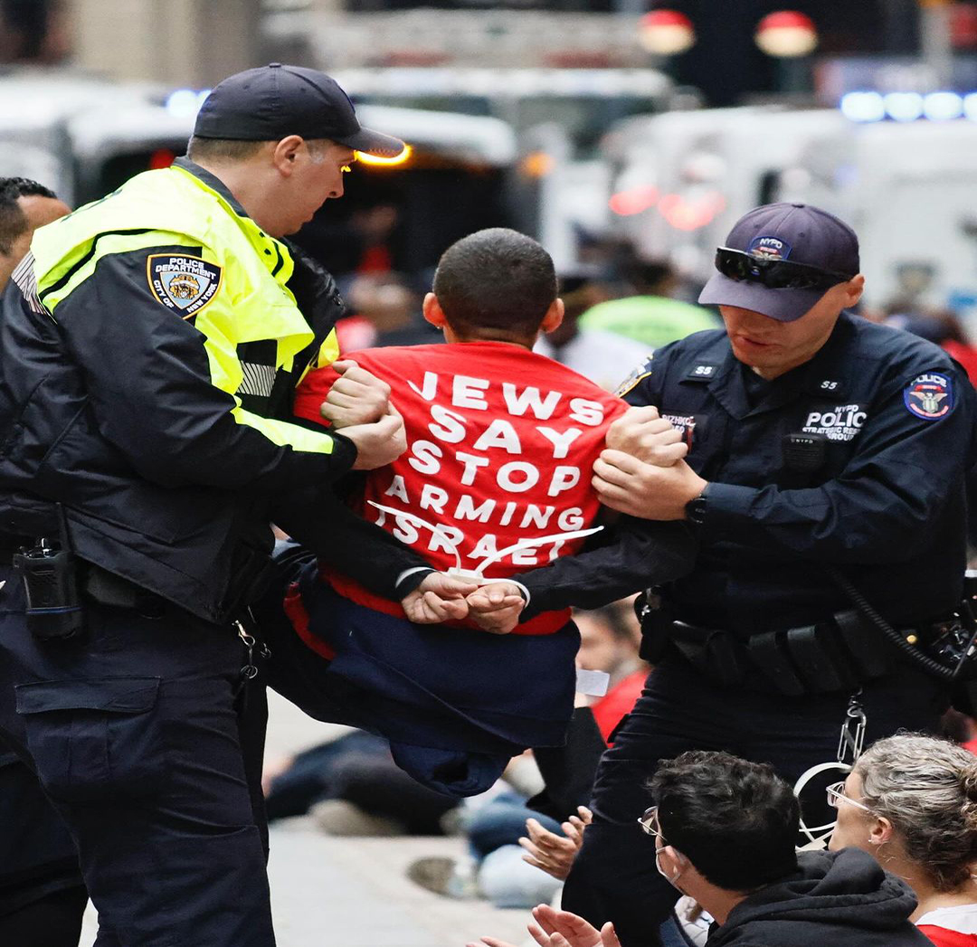 أكثر من مئتي متظاهر من مجموعة "أصوات يهودية للسلام" وحلفاء مناصرين لفلسطين ومناهضين للإبادة الإسرائيلية-الأميركية، ألقي القبض عليهم قرب "وول ستريت" في مدينة نيويورك، من أمام سوق البورصة الأهم والأشهر في العالم، يوم الاثنين في 14 تشرين الأول/ أكتوبر 2024، بعد أن عرقلوا افتتاح السوق وحاولوا إغلاقه، مطالبين بإنهاء أي دعمٍ أميركي للحرب الإسرائيلية على غزّة وعلى لبنان.