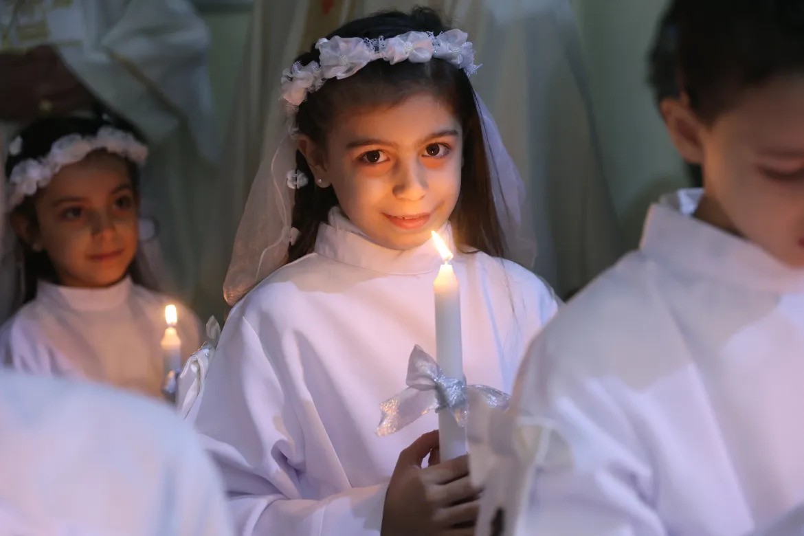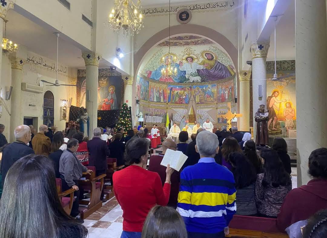 من القداس الذي أقيم في كنيسة "العائلة المقدسة" في غزة في 23 كانون الأول/ ديسمبر 2024، بحضور بطريرك القدس للاتين في زيارة تضامنية.