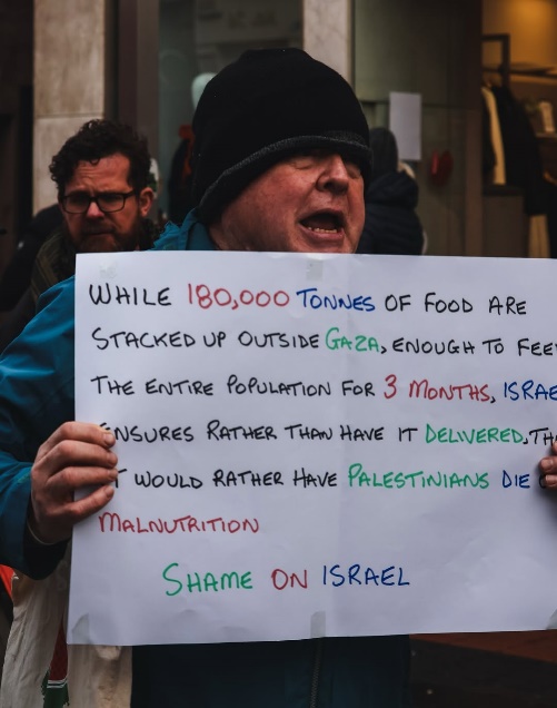 من مظاهرة يوم السبت في 11 كانون الثاني/يناير 2025 في مدينة "كورك". رفع المشاركون يافظات تدعو إلى تحرير الطبيب المعتقل لدى جيش الاحتلال حسام أبو صفية، وإلى إدخال المساعدات والطعام الذي يمنع الاحتلال دخوله. (الصور عن صفحة (StreetsCork) على انستغرام).
