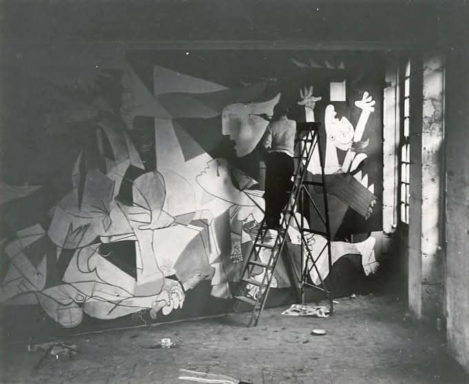كثّفت لوحة بيكاسو، في مشهد بانورامي واحد، الأهوال والفظائع التي خبرتها المدينة: صرخة الأم، الطفل المدمَّى، الجسد المشظّى، حطام البيت، حتى الحصان والثور والحيوانات التي عاشت بين البشر تعلن رعبها.