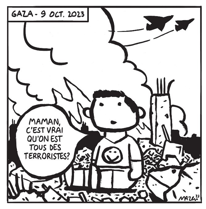 تعلو غلاف الكتاب (منشور عن دار آكت-سود افرنسية) عينٌ كبيرةُ مبسّطة إلى أقصى حد، مفتوحة على وسعها، تسأل "هل تروننا حقاً؟" (بالفرنسية). أظننا بتنا نعرف الإجابة على هذا السؤال، بعد أكثر من عام ونصف. والآن، بعد كل هذا، وأمام كتاب رسومات تصويرية لا أكثر، تثور ثائرة ب"المجلس التمثيلي للمؤسسات اليهودية الفرنسية (CRIF)"، فيسعى جاهداً إلى حظر هذا الكتاب، عبر التحريض ضده وتوجيه رسالة إلى المكتبات الفرنسية لمنع بيع الكتاب أو عرضه!
