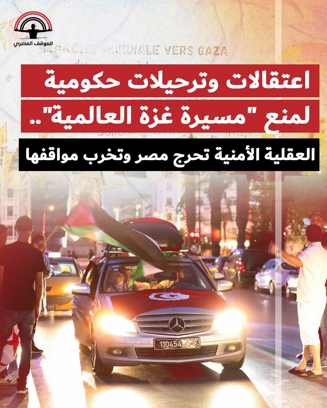 بينما كانت تعلن مواقع صحفية مصرية عن انطلاق "المسيرة العالمية إلى غزة" اليوم الخميس، في محاولة للمزايدة على قافلة الصمود القادمة من دول المغرب العربي نحو معبر رفح، واجهت الأجهزة الأمنية القادمين إلى مطار القاهرة بشكل رسمي للمشاركة بالاعتقالات والانتهاكات والترحيل.