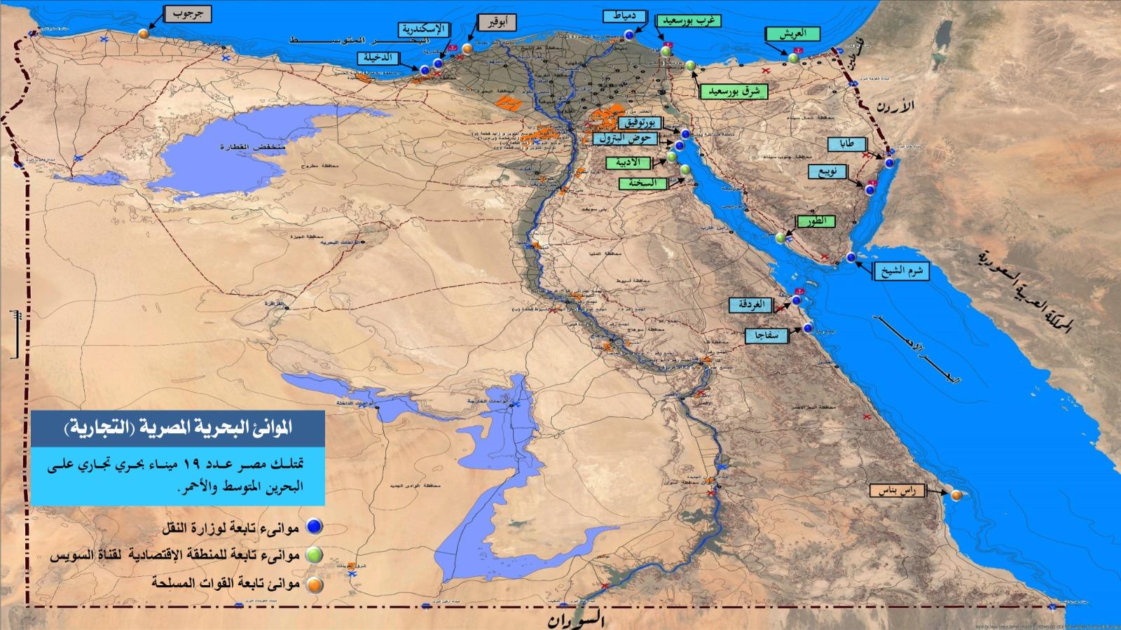 تُعد الموانئ البحرية المصرية من أبرز المراكز اللوجستية في المنطقة العربية. وبحسب البيانات الرسمية، تمتلك مصر 19 ميناءً بحرياً تجارياً على البحرين الأحمر والأبيض المتوسط، موزعة على موانئ تابعة لوزارة النقل، وأخرى تابعة لهيئة قناة السويس، وموانئ تابعة للقوات المسلحة.. وهناك 36 ميناء تخصصياً تتوزع على 16 ميناءً بترولياً، و6 موانئ تعدينية، و6 موانئ سياحية، و 6 موانئ صيد، و2 من الموانئ ذات الطبيعة الخاصة.
