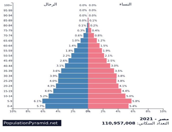 يُظهر الهرم السكاني المصري في العام 2021، وفقاً للمؤشرات[3] انخفاض فئة المواليد تحت أربع سنوات، وتقلّص في القاعدة بسبب انخفاض معدلات الخصوبة، لكنه يظهر أيضاً أن الفئة العمرية من 5 إلى 9 سنوات تمثل النسبة الأكبر من بين الفئات العمرية المختلفة. وتتهم الفئات غير المعيلة باستنزاف الموارد، خاصة الفئة تحت 15 سنة، لكن ومن ناحية أخرى فإن الاستثمار في تلك الفئة يعد استثماراً في المستقبل.