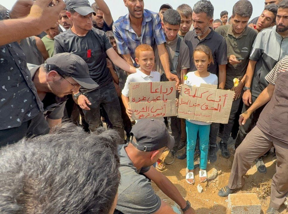 "أنس كلمة الحقّ ضد المحتل".. "وداعاً يا عينَ غزّة".. من دفن الشهيدين أنس الشريف ومحمد قريقع الذي حضره أهالي غزة، مودعين بأسى أبنائهم وصوتهم المغدورَين (الصورة عن مواقع التواصل).