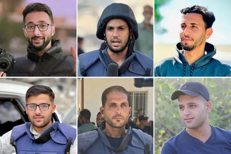 الصحافيون الشهداء الستة الذين اغتالهم الاحتلال يوم 10 آب/أفسطس 2025 في خيمة الصحافيين مقابل مستشفى الشفاء في غزة.