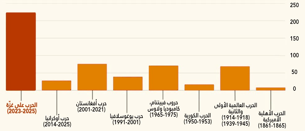 رسم بياني لعدد الصحافيين الذين قُتلوا في حروب مختلفة عبر التاريخ. عدد الصحافيين الذين قتلوا في غزة أكثر من ضعف أولئك الذين قتلوا في الحربين العالميتين الأولى والثانية مجتمعين. (هذه الأرقام مأخوذة عن موقع "Cost of War" (أكلاف الحرب) التابع لكلية واتسون للشؤون الدولية والعامة بجامعة براون).