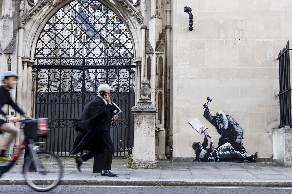 استيقظَتْ العاصمة البريطانية لندن صباح الاثنين في الثامن من أيلول / سبتمبر الحالي على مفاجأة صغيرة. عملٌ "تخريبي" من توقيع فنان الغرافيتي الشهير "بانكسي"، مرسوم على جدار مبنى محاكم العدل الملَكية وسط المدينة. يُصوِّر رسم الغرافيتي قاضياً بلباس القضاة التقليدي، بشعره الأبيض المستعار، مستخدِماً مطرقة القُضاة التي تُعلَن بها أحكام العدالة عادةً، ولكن هذه المرّة كأداة اعتداء، يضرب بها متظاهراً مطروحاً أرضاً، أعزلَ إلّا مِن يافطة صغيرة، لُوّثت بدمه بفعل الضرب.