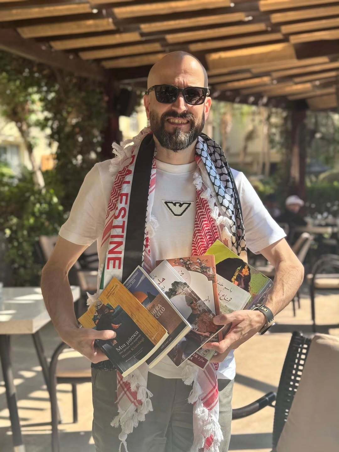 نظرة إلى الأسير المحرر الروائي باسم خندقجي، الذي فاز بجائزة "بوكر" الأدبية الرفيعة عن روايته "قناعٌ بلون السماء" وهو في الأسر، يحتضن مؤلفاته بعد أن تحرر من سجون الاحتلال.