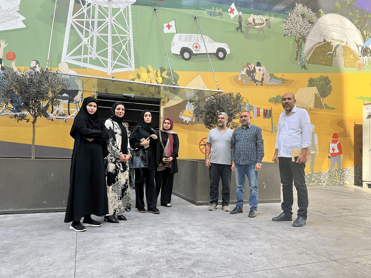 أهالي الأسرى أمام جدارٌ ملوّن بلوحات الإغاثة والإسعاف من أمام مقرّ بعثة اللجنة الدولية للصليب الأحمر في بيروت