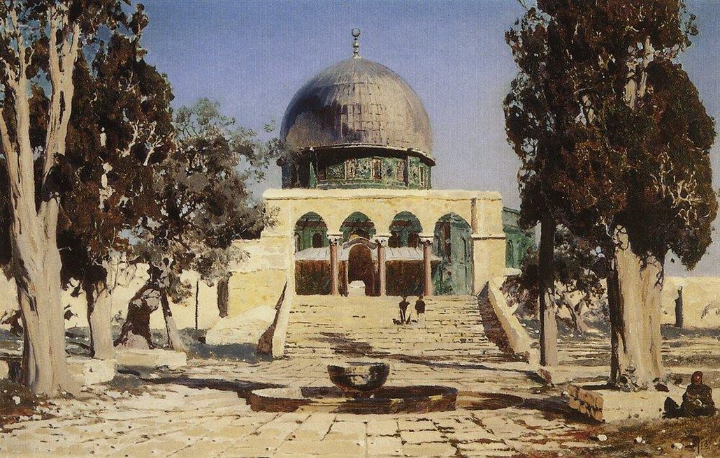 وفي قصاصة تعود إلى الخامس من شباط / فبراير، يقول: "قَضينا يومين نستكشف جميع معالم هذا المكان العظيم. كل شيء مُرتّب وعلى مرأى من الجميع، وهناك الكثير من الأشياء المثيرة للاهتمام والجميلة التي تستحق المشاهدة، لكن أجملها على الإطلاق هي الساحة المحيطة بالحرم الشريف (المسجد الأقصى أو مسجد عمر). لم أرَ شيئاً مهيباً أكثر منه، إذا ما استثنيتُ تلة إسكي سراي في إسطنبول فقط. بساتين الزيتون أيضاً جميلة جداً. كان الطقس في هذين اليومين غير عادي أيضاً، فقد تساقطت ثلوج ناعمة ورطبة باستمرار، حتى تحوّلتْ القدس إلى مدينة روسية. يقف فلاح يرتدي معطفاً من جلد الغنم ويرسم علامة الصليب: الحمد لله، تماماً كما هي الحال في بلادنا. ولكن بعد العاصفة، عندما بدأتُ العمل، حلّت أيام ربيعية رائعة. لم تكن الشمس حارقة بل دافئة قليلاً. هناك الكثير من المناظر الخلابة والمثيرة للاهتمام هنا، لدرجة أن المرء يصاب بالضياع التام. لدي الكثير من العمل، والوقت ضيق، وعلي أن ألقي نظرة سريعة على كل شيء. من المؤسف ألا أجد الوقت الكافي لوصف كل ما آراه بمزيد من التفصيل. (محفوظات معرض تريتياكوف – موسكو).