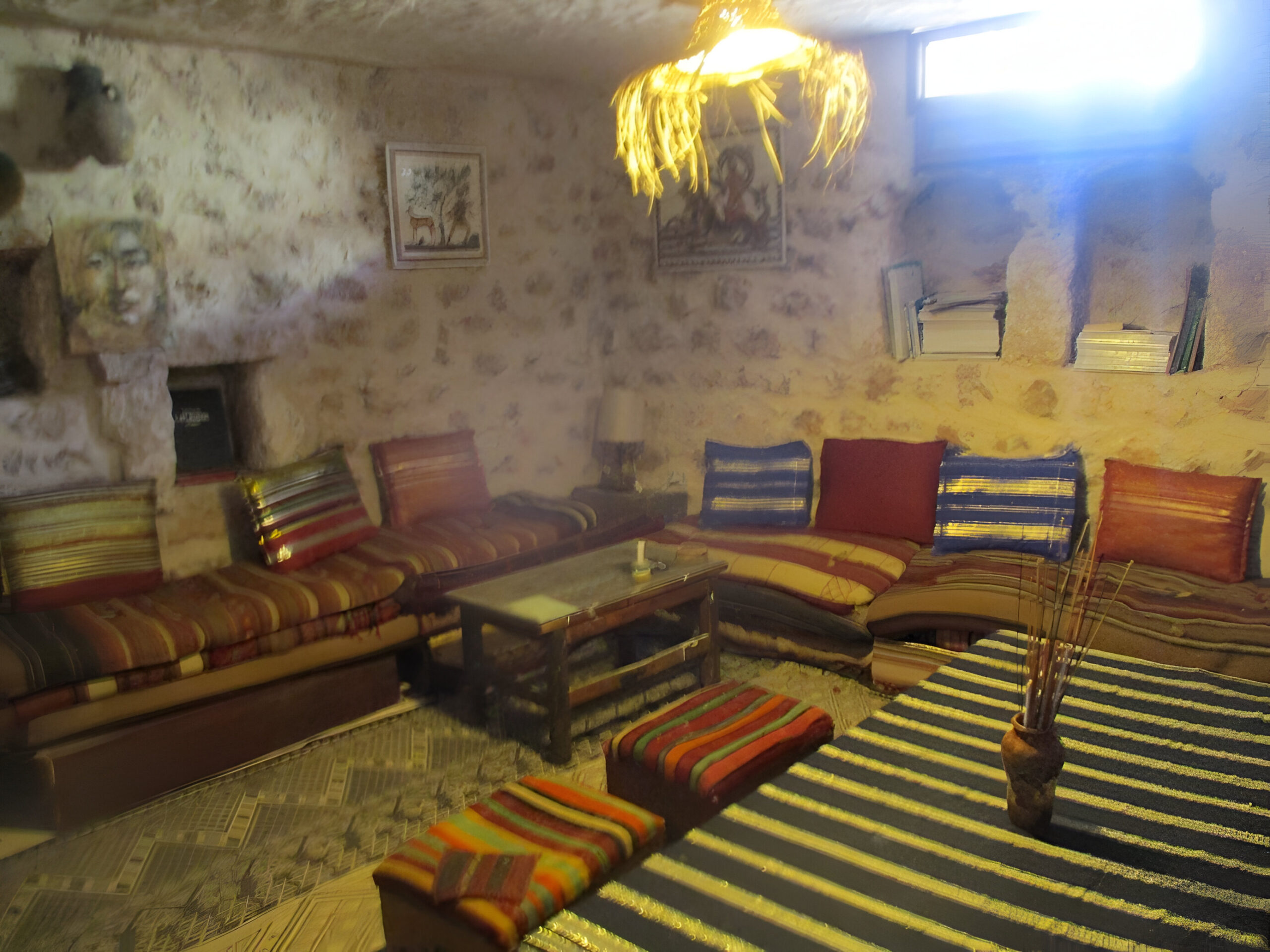 ينقسمُ القبو إلى جزأين، على يمينك صالة مربّعة الشكلِ مُزدانة بمقاعد خشبيّة مستطيلة تعلوها مرتبات وحشايا مُغلّفة بملاءات ومفارش زاهية، وقد فُرِشت أرضها بمنسوجات تقليدية محليّة، وُزّعت بين أرجائها طاولات من خشب الأبنوس، وتزيّن جدرانها لوحات من الفسيفساء البديعة، ويتدلّى من السقف فانوس مُحاطٌ بمظلة من سعف النخيل يمنحُ المكان رونقاً خاصاً، جُعل من هذه القاعة مقهى يقصده الزوار للتمتع ببعض الهدوء والأصالة.