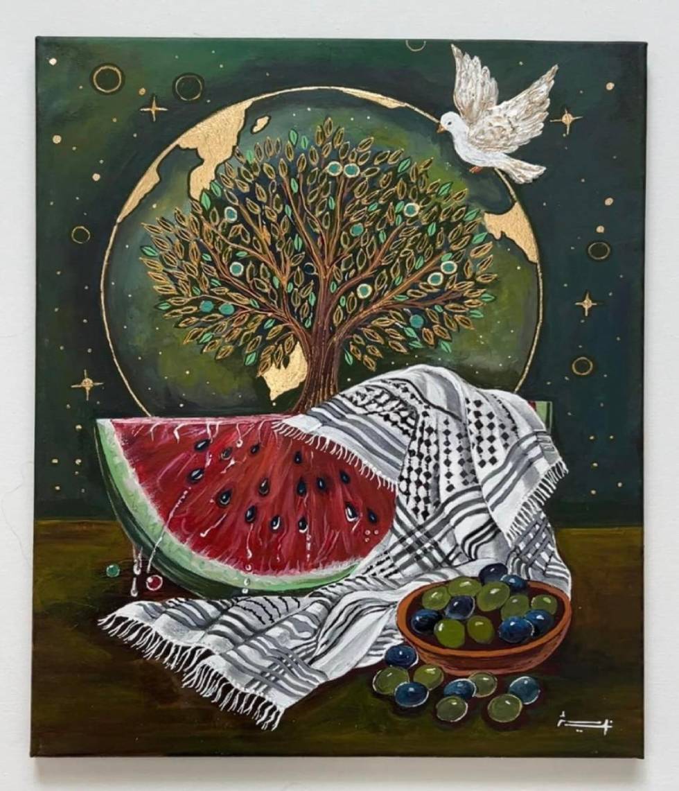 خلْفَ هذا المشهد كلّه، وعلى إحدى الأشجار في الحديقة، عُلّقت لوحة كُتب عليها "دم شهدائنا يرسم حياة".