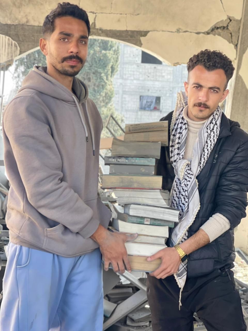 عمر وإبراهيم ومجموعة من الكتب التي أنقذاها، التي ستتحول إلى مكتبة غزة. في المنشور على اليسار، يكتب عمر: "هذه المكتبة كانت تحتوي ما يزيد عن 100 ألف كتاب. أحرق جيش الاحتلال 90 بالمئة منها تقريباً ورمى الكتب الباقية في حفرة حفرها الجنود بأنفسهم. حاولت إنقاذ ما تبقّى من هذه الكتب".