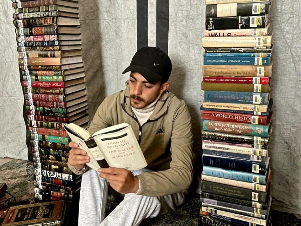 " كاتب وخيّاط وصيدلاني فلسطيني من غزة، شاهِدٌ على الإبادة"، هكذا يعرِّف عمر عن نفسه باختصار. طوال فترة الإبادة، كان هاجس إنقاذ مكتبته الشخصية عِلة بقائه. نقل مكتبته معه خلال عمليات النزوح المتكررة والمنهِكة، من الغرف إلى الخيام، ومن بيته إلى بيوت الأصدقاء. المهمّ أن تبقى المكتبة.