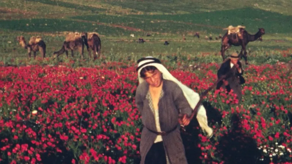 لقطة من الفيلم القصير "الزهور تقف بصمتٍ تشهد" (2024)، للمخرج اليوناني-الفلسطيني ثيو باناغوبولوس، يُعرض في مهرجان "باليناله"، ويستند إلى صور فوتوغرافية أرشيفية وجدها المخرج لرحّالة اسكتلندي وثّق أزهار فلسطين البرية في فترة الانتداب البريطاني.