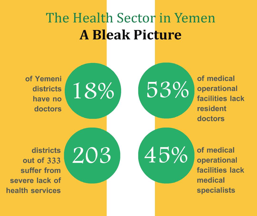 The country has been operating at half capacity in hospitals and healthcare centres, as qualified healthcare workers are lacking in Yemen. Fifty-three percent of operational facilities have no resident doctors, while 45 percent lack specialists.