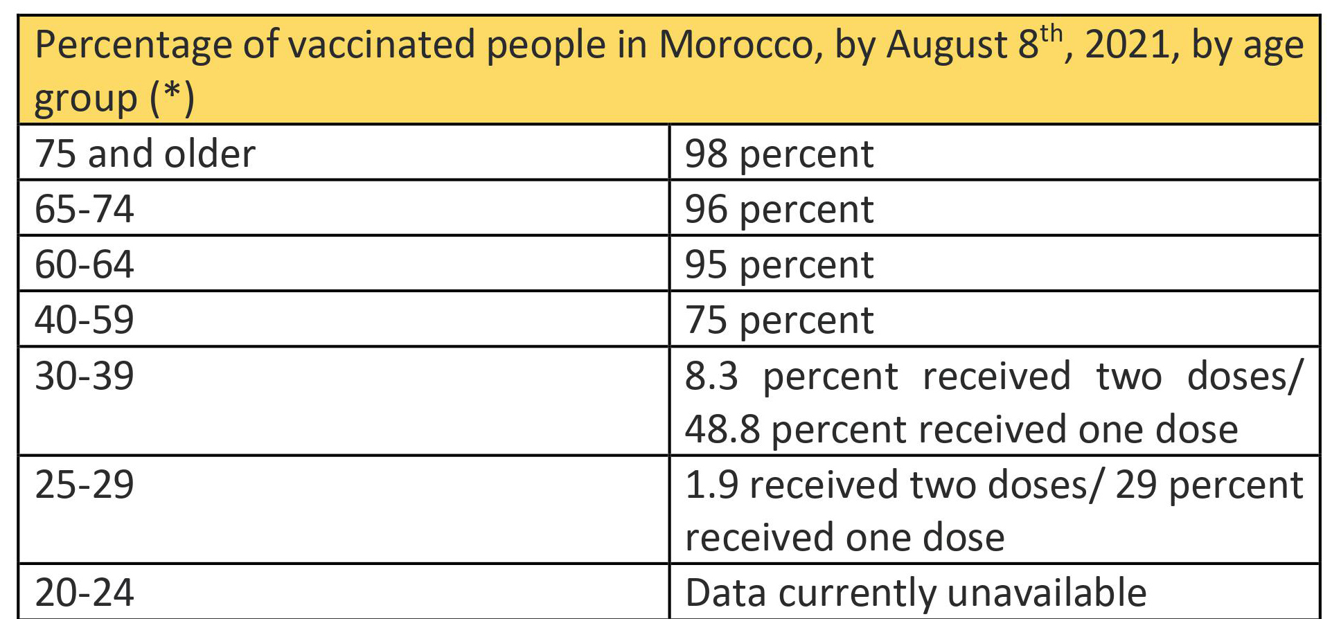 To administer its available vaccine doses, Morocco has adopted an age-group approach and a system of professional categorisation. Initially, 40-year old healthcare workers and older were targeted, followed by public and army officials, as well as the elderly (75 years and older). Then, age groups of 65-74, 60-64, 40-59, 40-39, and, finally, 25-29-year olds were contacted, in that order. As of August 7th, age groups have been extended to include 20-year olds and older.