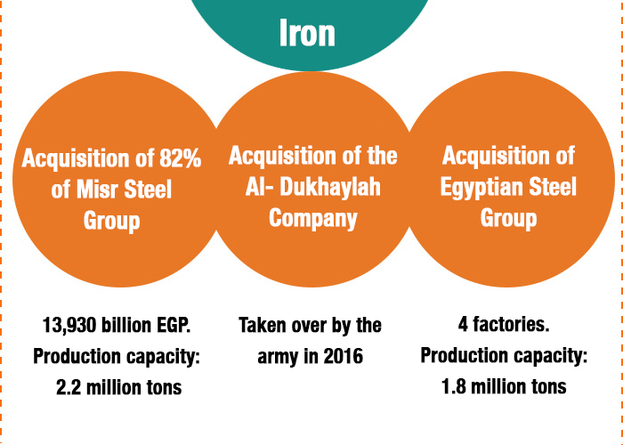 After the 2011 revolution and with the fall of Mubarak’s, Ezz was forced, under political pressure and settlement processes with the government, to abandon Al-Dukhaylah Company. Since then, the policies that control the threads of this industry, which produced 11.5 million tons annually until 2017, have begun to move unsteadily. However, with President El-Sissi assuming office in 2014, the iron industry was placed at the army’s fingertips through the National Service Projects Organization [NSPO].