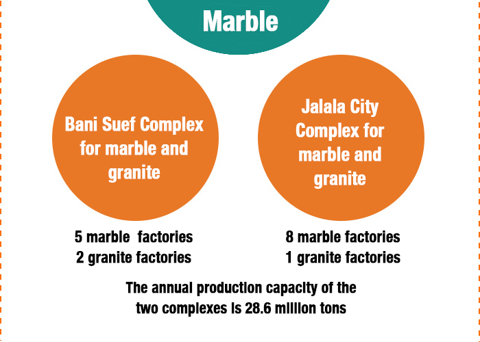 During the inauguration of the cement factory in Bani Suef in mid-August 2018, President El-Sissi's schedule included the inauguration of another huge project - the Bani Suef complex for marble and granite, which includes five marble and two granite factories with a production capacity of 3.6 million square meters annually. During this visit, President El-Sissi stressed that there was a plan to build complexes close to all quarries in Egypt, whether in Sinai, Al-Ayn Al-Sukhnah, or Aswan.
