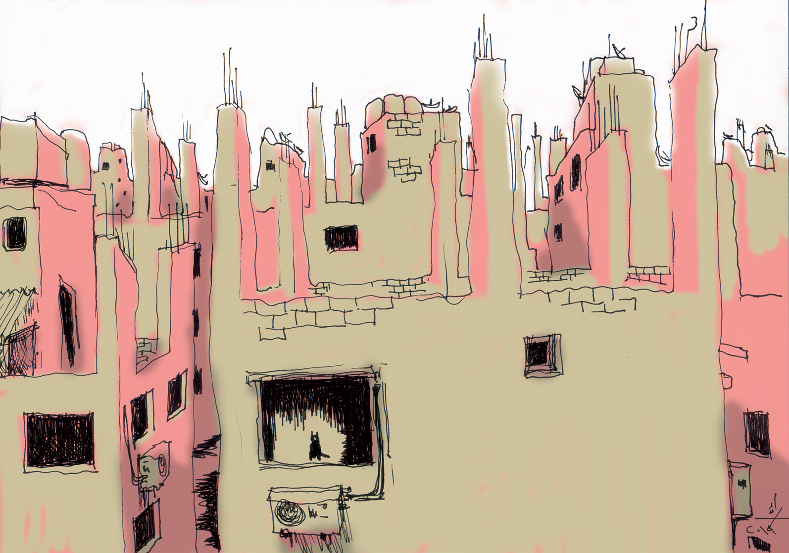 Shantytowns in Morocco are called “barariques”, derived from the French “baraques”, meaning tin shacks. This “undesirable landscape” is widely dubbed “khnouna” (meaning “snot”) in Moroccan Arabic, especially when those grey tin entities peep through the shimmering glass skyscrapers, or when a new tramway line penetrates it, passing pompously through an odd, incoherent scene which amalgams modern forms and improvised spaces.