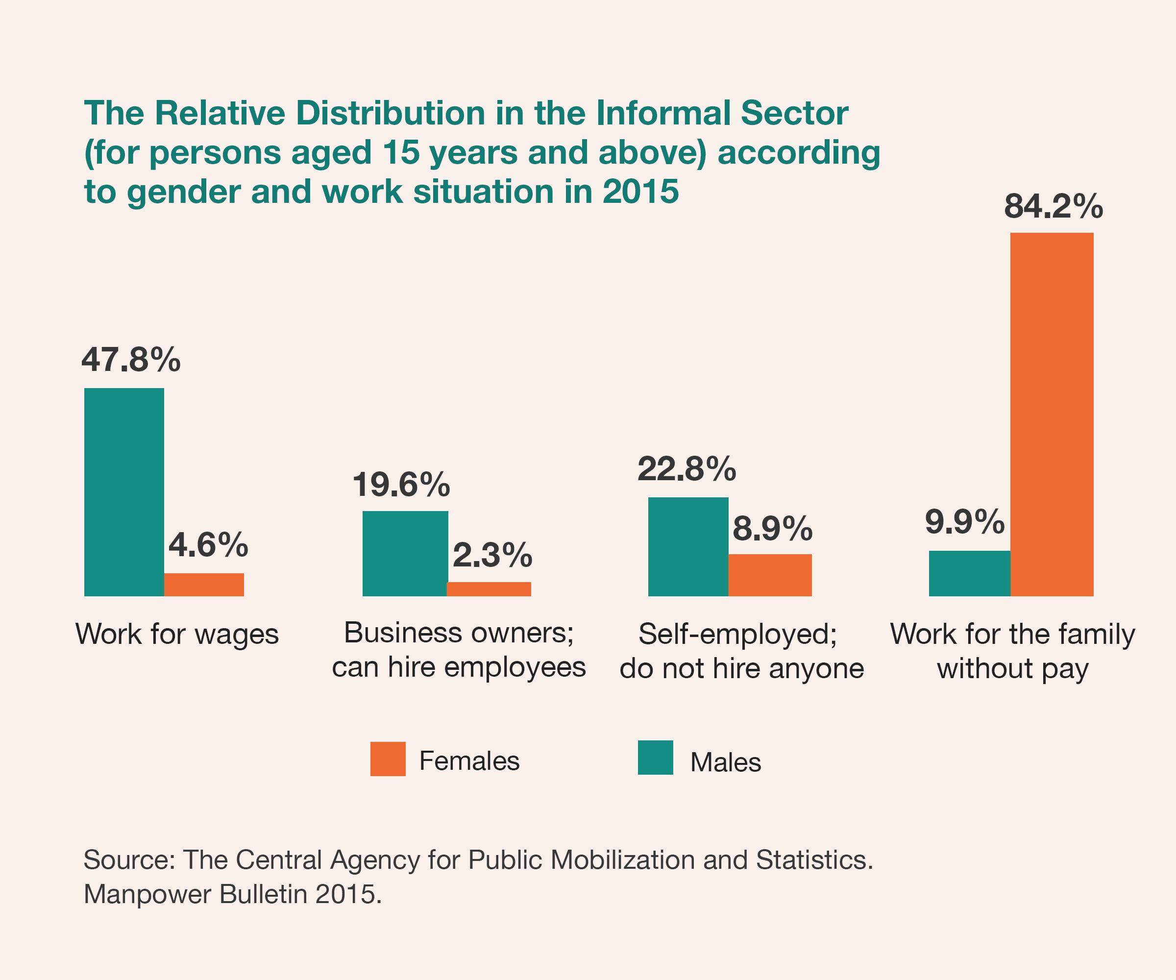 • 52.7% of employed men work in the formal sector, compared to 47.3% in the informal sector.
