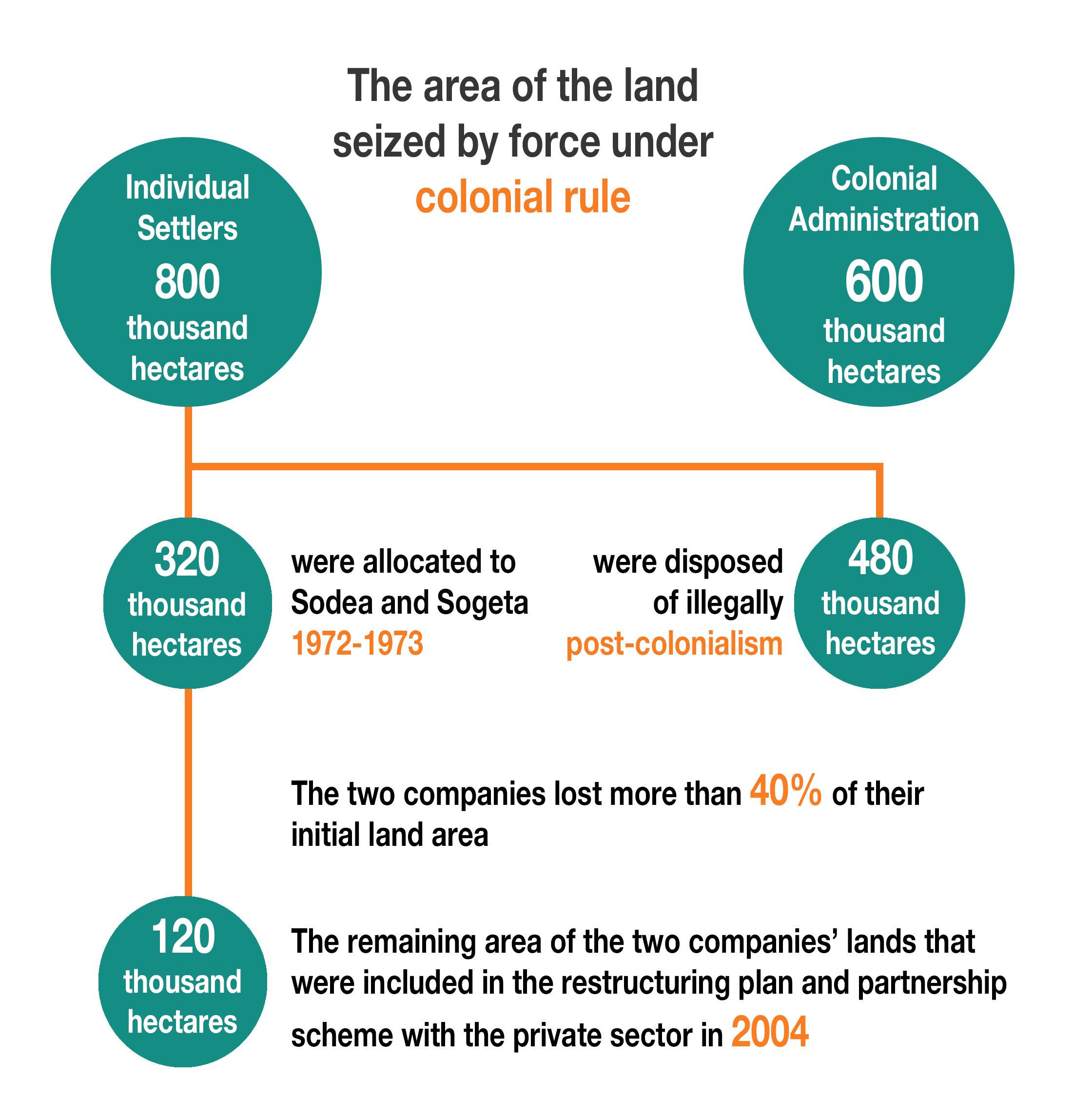 The two companies, Sodea and Sogeta, were launched in 1972/1973, with an area of 320 thousand hectares, from which the agrarian reform process benefited by about 90 thousand hectares. Over the following three decades, the two companies lost more than 40% of the area they initially had when they set out. The plundering that these lands were subjected to left only 120 thousand hectares, which is the area that was included by the restructuring plan or the so-called partnership with the private sector that began in 2004 through leasing property for a period ranging between 17 and 44 years subject to extension or privatization.