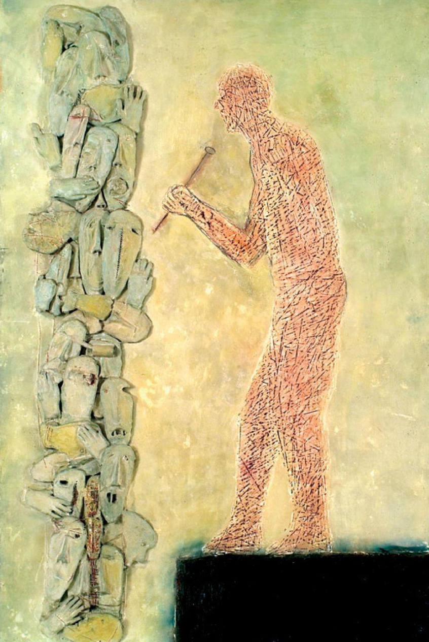 Nous avançons telle une procession sincèrement désolée, inquiète même, qui se rend, en fait, à un enterrement qui aurait dû avoir lieu, comme le veut la loi de Dieu et des hommes, il y a plus de cent ans.Et si nous nous taisons, c’est parce que nous sommes envahis par le bruit des batailles et l’odeur du feu, pour réinventer une scène tragique, dévastée, abandonnée pour enfin enterrer des corps disparus, enlevés dont il ne reste que les crânes pâles mutilés, des os en ivoire.