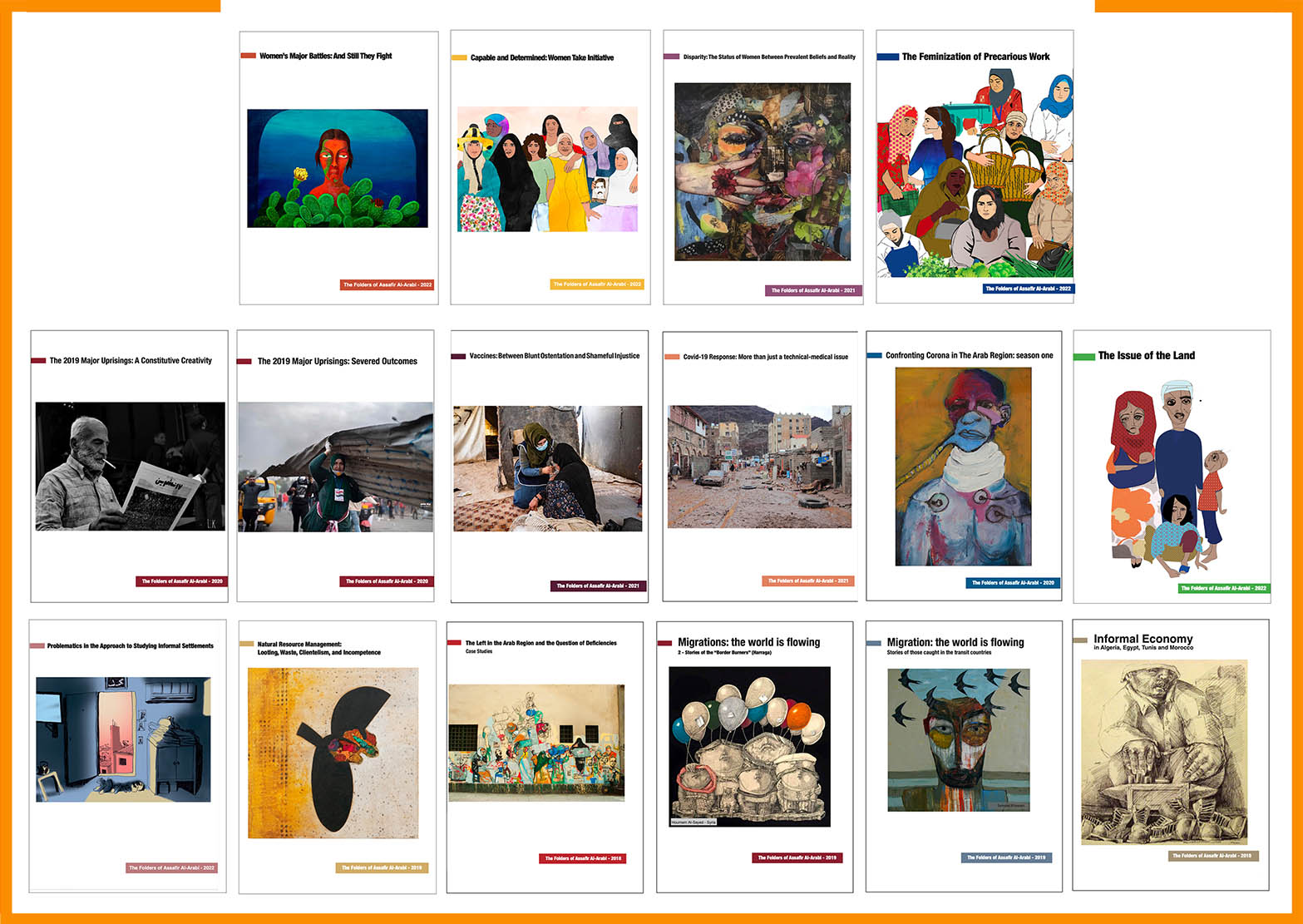 Toutefois, nous vous soumettons ici les titres français de ces cahiers, dans l’espoir que la version anglaise sera lisible par les francophones: Economie informelle : que génère ce système, Les migrations et la fluidité du monde (deux cahiers), La déficience de la gauche arabe, La gestion des ressources naturelles :prédation, clientélisme et incompétence, Les bidonvilles, Les soulèvements majeurs de 2019 et l’amputation des résultats, Les soulèvements de 2019 : une créativité constituante, Faire face au Covid n’est pas qu’une entreprise technique (2 cahiers), Les vaccins : une honteuse injustice, Le statut des femmes entre les convictions dominantes et la réalité, Les initiatives des femmes : capables et déterminées, Les grandes batailles des femmes : nous continuons !