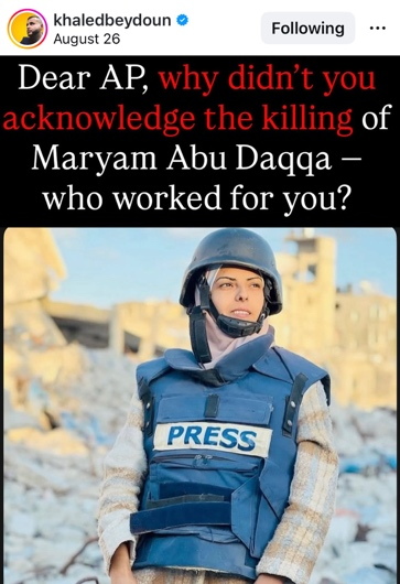 L’exécution des nombreux journalistes est très peu rapportée dans les médias mondiaux et jusque récemment a été largement ignorée par les professionnels du métier qui pendant presque deux ans ont trahi leurs collègues palestiniens. Comme le dit ce post Instagram « Gaza brûle, la presse se tait : AFP, ou êtes-vous ? Chaque jour Khadija Toufik risque sa vie, pourquoi son travail n’est-il pas relayé ? » Contre ces oreilles sourdes des travailleurs des médias en occident, des millions de citoyens ouvrent leurs yeux et leurs oreilles aux Palestiniens qui transmettent depuis le site du génocide, et exercent l’obligation de les écouter afin que les conditions du partage de la vérité de ce qui se passe à Gaza soient maintenues.